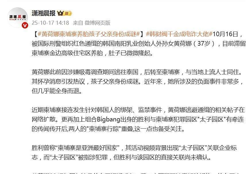 其中,最受关注的是Bigbang出身的李胜利。他曾公开宣称“柬埔寨是亚洲最好国家”,其活动背景板上清晰出现“太子集团”标志——该集团被多次指控涉及赌博、绑架及人口贩卖。尽管李胜利与园区的直接关联尚未确认,但两人行踪的“巧合”已引发无限联想。最新消息显示,黄荷娜现身金边时肚子已微微隆起,确认怀孕。然而,孩子父亲的身份成谜,为这场本就扑朔迷离的逃亡再添一笔悬疑。柬埔寨知情人士透露,黄荷娜在当地涉嫌组织性交易、贩毒与洗钱,不仅召集韩国熟人诱导性交易,更协助当地财阀洗钱。其背后可能存在的财阀与跨国犯罪网络深层勾结,令韩国警方高度紧张,已紧急请求国际刑警组织协助追踪。面对这出融合了财阀、毒品、性交易、电诈、离奇命案与孕期逃亡的“大型连续剧”,韩国网友只能无奈嘲讽:“《顶楼》《黑暗荣耀》拍的都是现实”、“这剧本,编剧都不敢写”。从法律豁免到全球通缉,从吸毒丑闻到电诈核心,黄荷娜的“堕落史”不仅是个人的疯狂,更成为照向财阀特权与跨国犯罪网络的一束刺眼强光。下一次,她又将逃往何方?或许,答案就藏在那金边豪宅的未出世婴儿,与越发庞大的电诈资金流之中。#优质好文激励计划#
