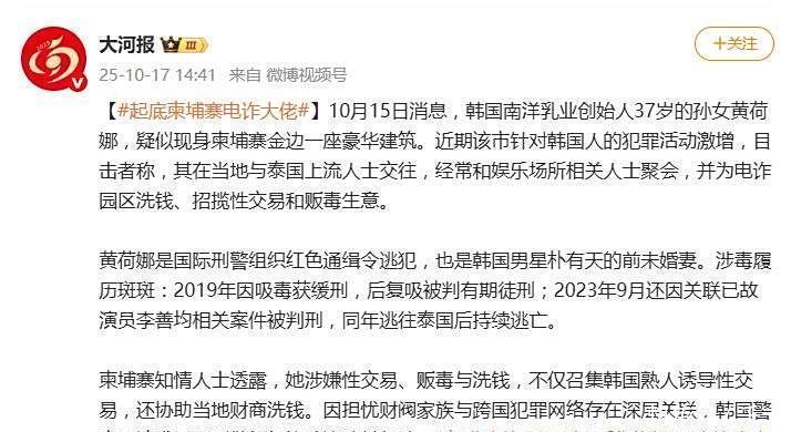 曾被韩国网友戏称为“司法豁免者”的财阀三代黄荷娜,近日再次以惊悚剧情刷新了公众认知。这位身背国际刑警红色通缉令的南洋乳业外孙女,不仅被曝藏身柬埔寨金边高级住宅区,更已怀有身孕,在逃亡中安心“养胎”。而她背后牵扯出的跨国电诈、洗钱网络与一连串离奇死亡案件,正演出一幕幕连韩剧都编不出的现实荒诞剧。